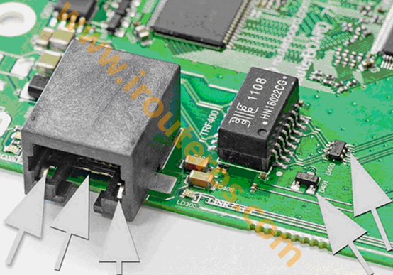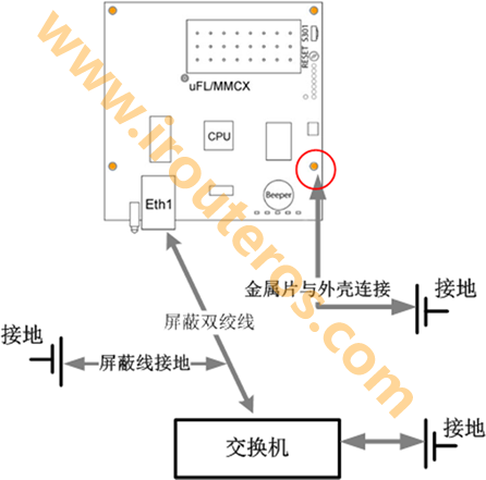 1.三个箭头标记了以太网口的接地金属片,RouterBOARD以太网口左右两边的2个金属片,用于屏蔽双绞线接地
