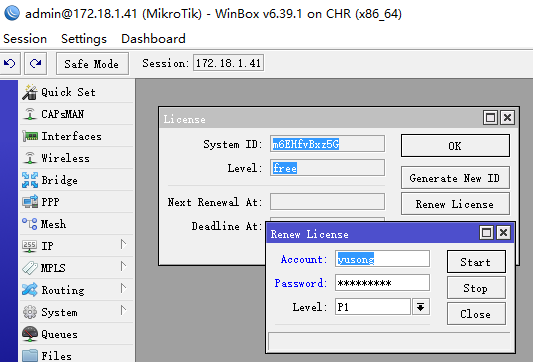 下面通过Winbox方式注册,进入system license菜单,点击Renew License,输入账号密码,和需要申请的等级