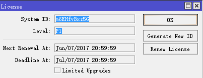 60天免费许可期限到后,在License菜单下的Limited Upgrades将会被勾选,即RouterOS将无法在升级,如果你计划购买选择的许可,你必须在60天内申请购买正式许可。如果60天内未购买,期限到后该CHR 的System ID将从你的MikroTik账户中删除,该CHR 的System ID将无法使用,必须重新安装一次CHR,并重新申请购买。