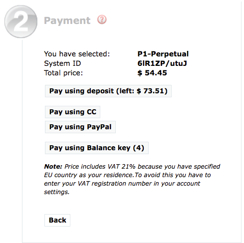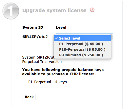 可以选择账户余额(deposit),信用卡(CC),PayPal或使用帐户预存key付款(prepaid)支付。付费完后,新的许可通过网络注册到你的CHR。当然也可以通过淘宝上找代理商购买CHR许可,代理商价格要比官方价格便宜很多,申请后代理商通过转让许可的方式,将许可转到你的MikroTik账户,完成注册。