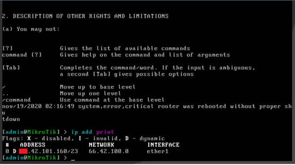 进入控制界面后,通过/ip add print检查ip地址