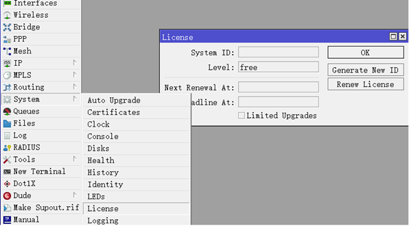 进入winbox配置完成后,可以申请CHR的许可,但需要先注册MikroTik账号,进入system license查看ID