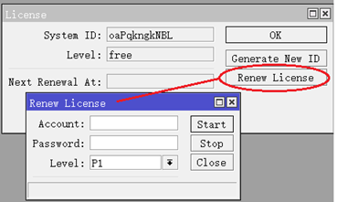 点击renew license,输入MikroTik注册的账号密码,申请P1许可,可以免费使用60天