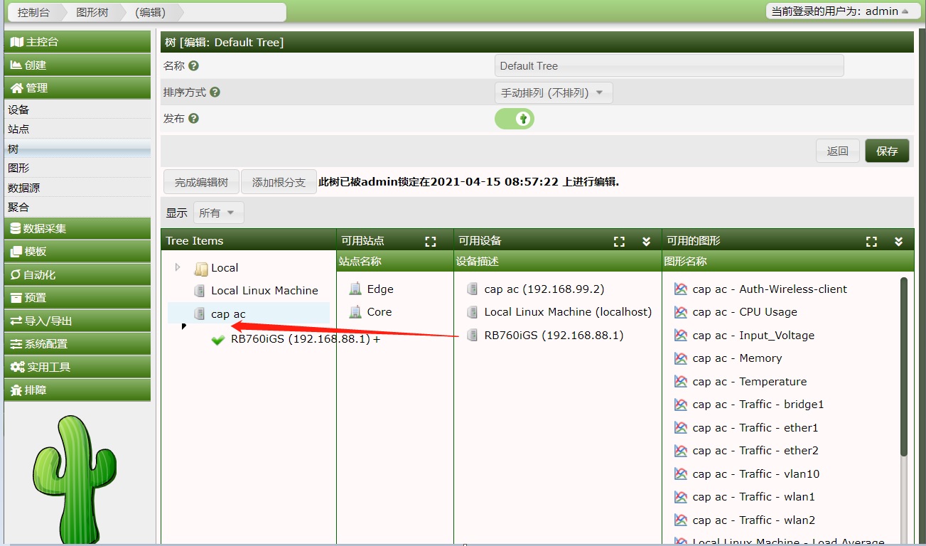 通过拖动,我们刚创建的设备RB760iGS,到Tree Items下的Local节点下,这个栏是可以编辑树形结构的,然后点击“完成编辑树”