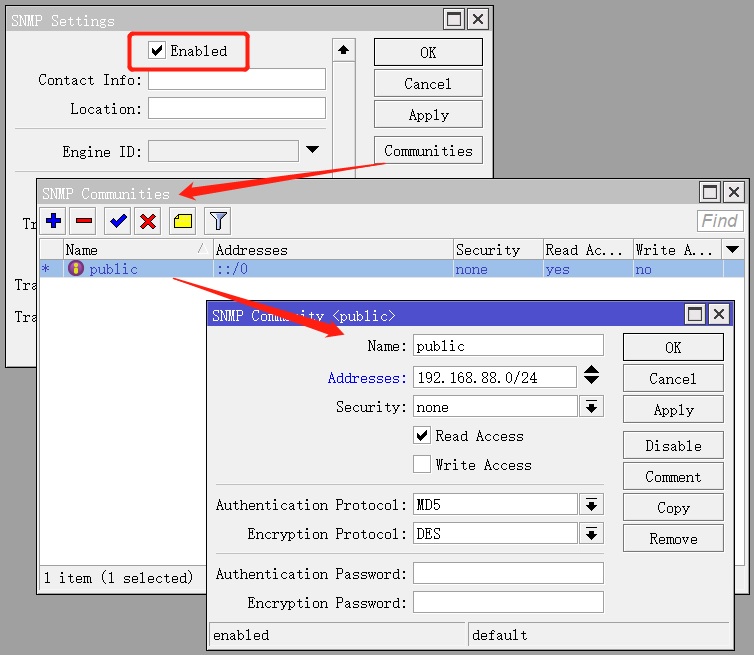 首先配置RouterOS的SNMP协议,需要进入IP->SNMP菜单配置,如下:
