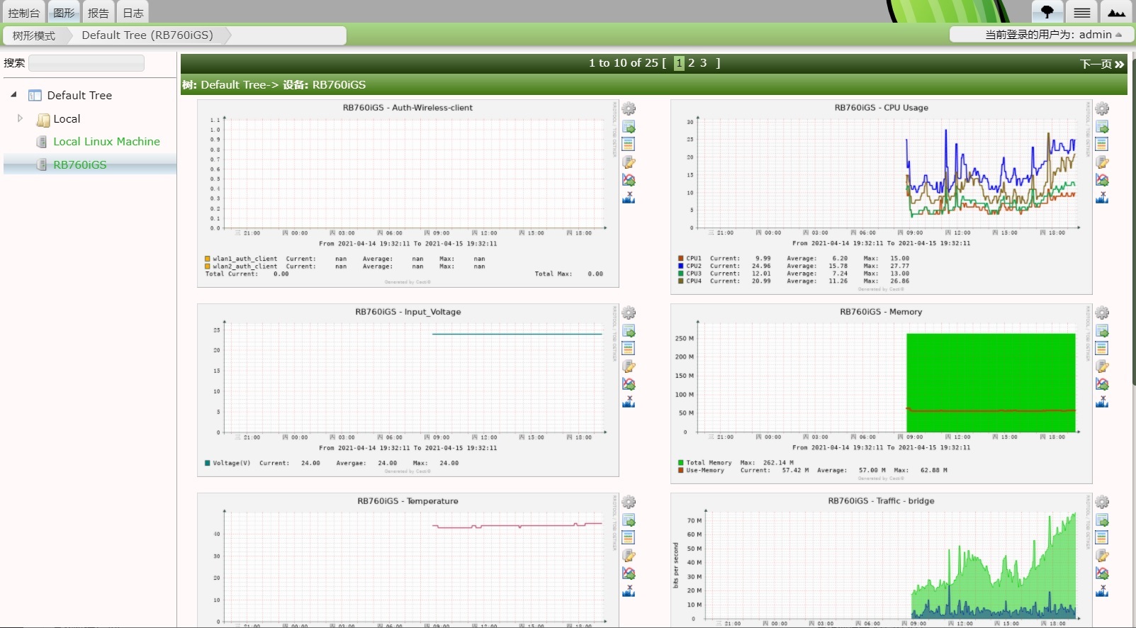 之后我们点击图形,打开Default Tree就可以看到添加的RB760iGS的CPU、电压、内存和温度状态,还有接口流量情况,如果有无线网卡的RB设备,可以获取无线用户接入数量统计。
