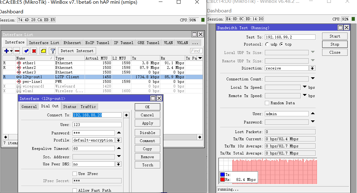 从测试结果看未使用IPsec加密的L2TP的传输带宽性能最好,超过了WireGuard,但在使用IPsec的L2TP加密后,性能远不如WireGuard,我平时喜欢使用SSTP在RouterOS设备之间建立连接,因为SSTP端口灵活,在RouterOS建立隧道无需证书,但SSTP的传输性能在RouterOS支持的所有隧道协议中性能是最差的,现在v7有了WireGuard就不一样了。