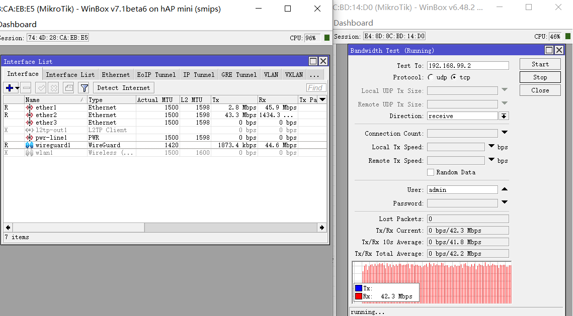- 用户端RB951Ui-2HnD,作为模拟终端设备进行bandwidth-test带宽测试发起端(RouterOS v6.48.2)