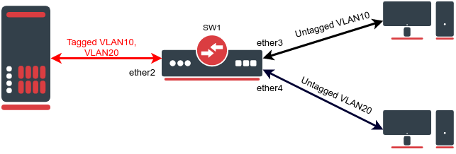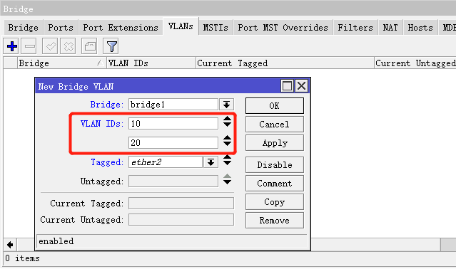 add bridge=bridge1 tagged=ether2 untagged=ether4 vlan-ids=20