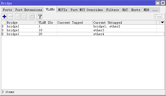 add bridge=bridge1 tagged=ether2 untagged=ether3 vlan-ids=10