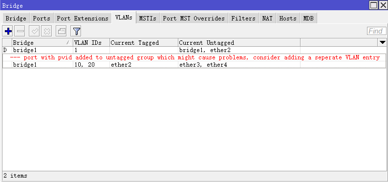 虽然流量被正确地从access端口转发和标记到trunk端口ether2,但会出现广播或组播数据包实际上在两个untagged未标记的access端口之间扩散。VLAN20和30之间不再被隔离,因此可以嗅探来自不同VLAN网络的流量。当查看网桥VLAN表时,会注意到已经为VLAN 10和20创建了一个规则条目,这个trunk规则允许vlan20和30可以在ether3和ether4同时使用,RouterOS也用红字发出了警告: