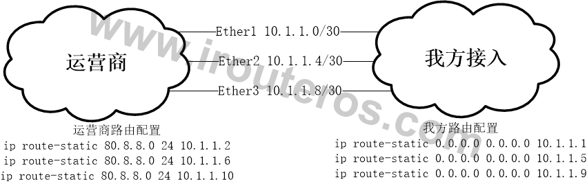 这里我们排除链路聚合口的配置,选择3组/30子网互联地址,将一个C段的IPv4地址,假如IPv4地址是:80.8.8.0/24,运营商会配置3条静态路由,指向3个互联接口的IPv4地址,我方也会配置3条默认路由到3个互联接口的IPv4网关,这个是最常见的ECMP协议,保证3个接入端口流量均衡,IDC网络中应用非常普片。互联配置如下: