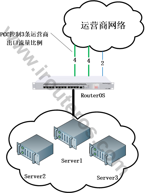 考虑另外一个场景,方向是去一个集群服务器,也就是和之前的案例反过来,RouterOS需要面向客户,让集群服务器需要确保流量调度均衡,也需要按比例分配一定流量,同样是4:4:2,需要标记5条路由规则,下图是服务器集群是三台和RouterOS都有一个/30子网互联: