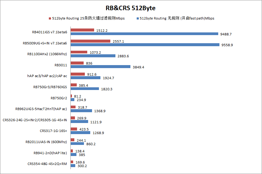 选择路由模式的数据更能体现路由器作为三层IP路由转发性能,这个模式下选择了两种参数:无规则转发和添加25条防火墙规则转发,下图是,64byte的路由模式下转发性能,单位是Mbps,也就是在这个模式下实际的带宽转发流量。