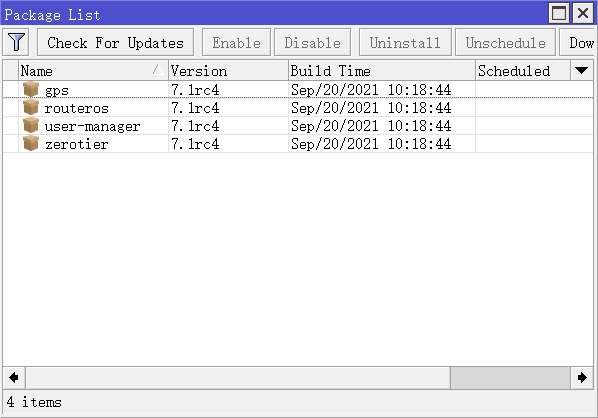 RouterOS可以安装GPS功能包,支持包括GPS、中国北斗、欧洲伽利略和俄罗斯格林纳斯,RB设备集成GPS接收器的设备包括LtAP、LtAP mini、KNOT等设备,不集成GPS接收器的RB和x86设备可以使用USB扩展GPS模块。在winbox进入system package目录下,确认是否安装GPS功能包:
