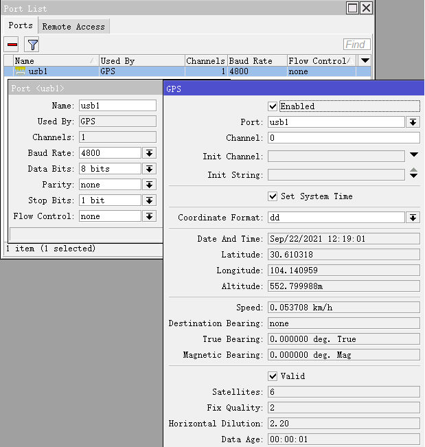 Winbox配置usb1的GPS接收器: