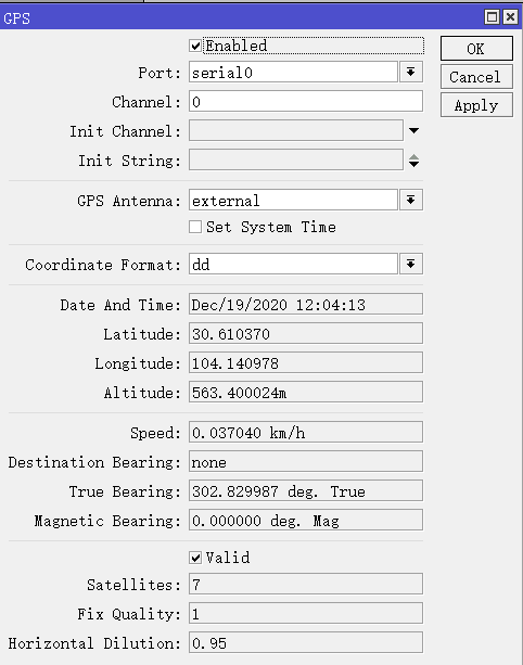 [admin@MikroTik] /system gps> set enable=yes port=serial0