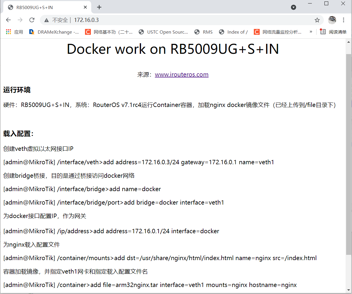 RB5009UG+S+IN开机测试视频),由于RouterOS不支持pull,因此需要通过其他系统安装有docker的设备,提取对应平台的文件。测试平台是RB5009UG+S+IN,具备1G内存和1G存储,自身条件满足运行docker。