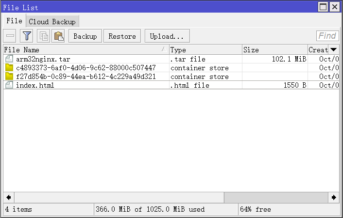 从树莓派下载文件后,通过winbox将arm32nginx.tar上传到RB5009上,同时上传做好的index.html文件