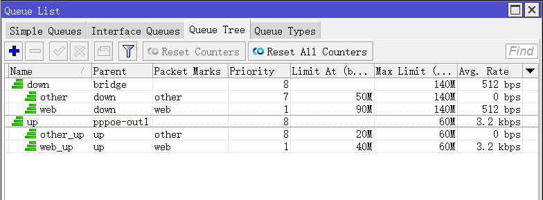 /queue tree add max-limit=140M name=down parent=bridge add max-limit=60M name=up parent=pppoe-out1web流量优先于其他流量priority设置1,其他流量priority优先级设置8,