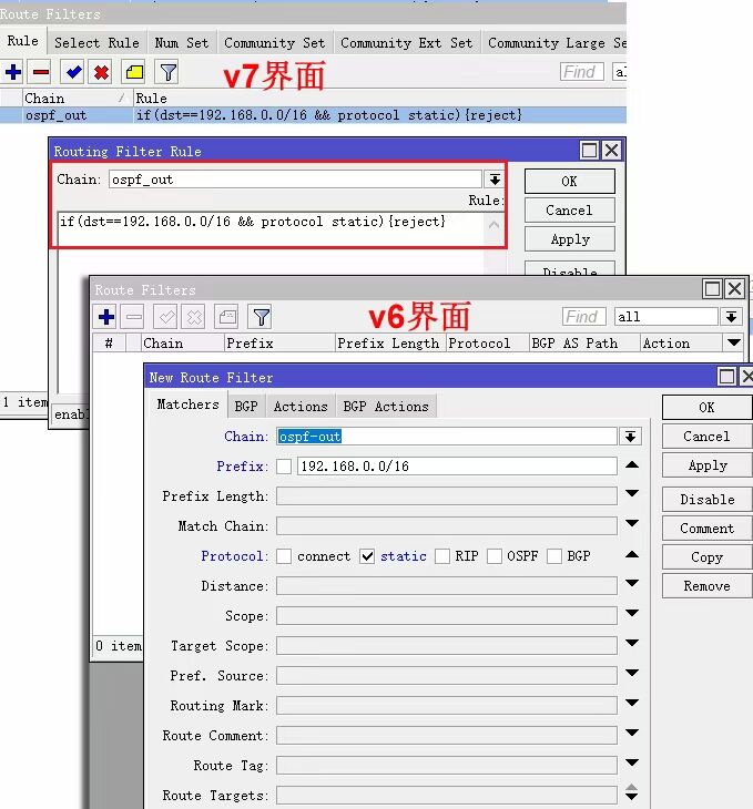 例如,在v6的规则 "/routing filter add chain=ospf_in prefix=172.16.0.0/16 prefix-length=24 protocol=static action=accept",转换为v7的配置如下: