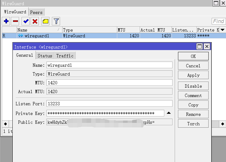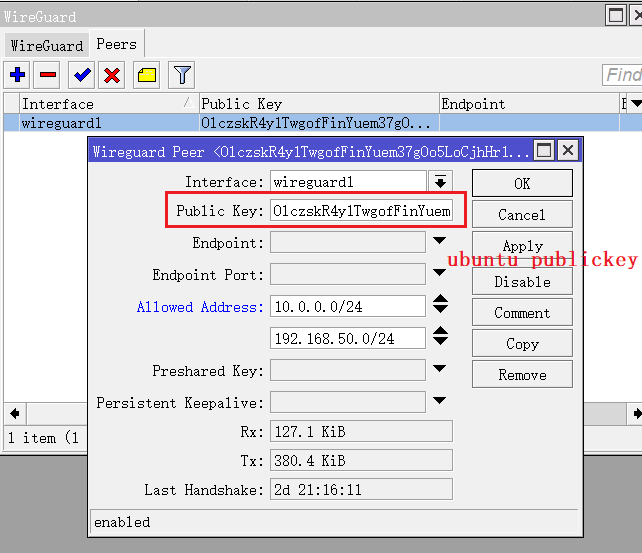 记录下RouterOS上wireguard1接口的Public Key,需要在ubuntu配置时添加。