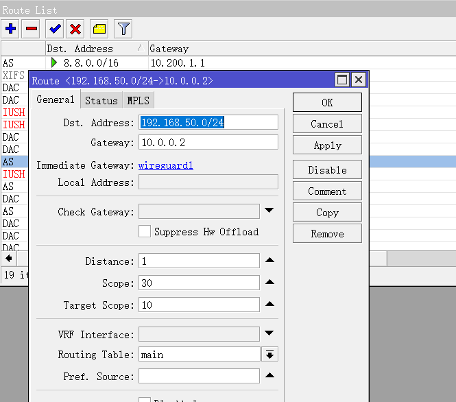 查看路由,可以看到wireguard自动添加了静态路由: