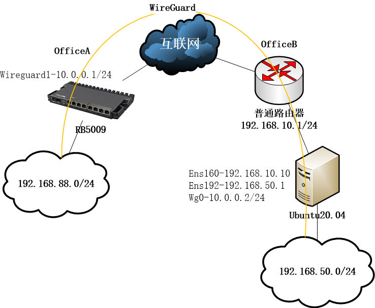 在这个拓扑上可以看到,RB5009和Ubuntu20.04建立WireGuard隧道,在ubuntu下有一个独立的网络192.168.50.0/24与OfficeA的192.168.88.0/24做路由互联访问。