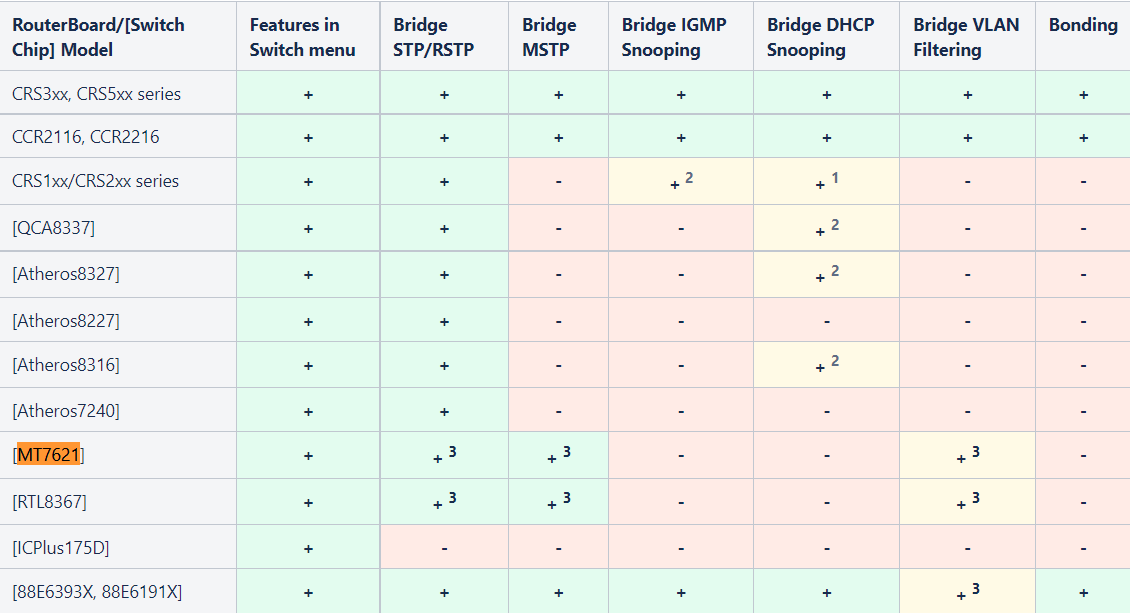 看看官方对采用MT7621芯片的RB750Gr3(RB760iGS也是MT7621芯片,多一个SFP光口,但这个光口独立于交换芯片外)二层功能支持: