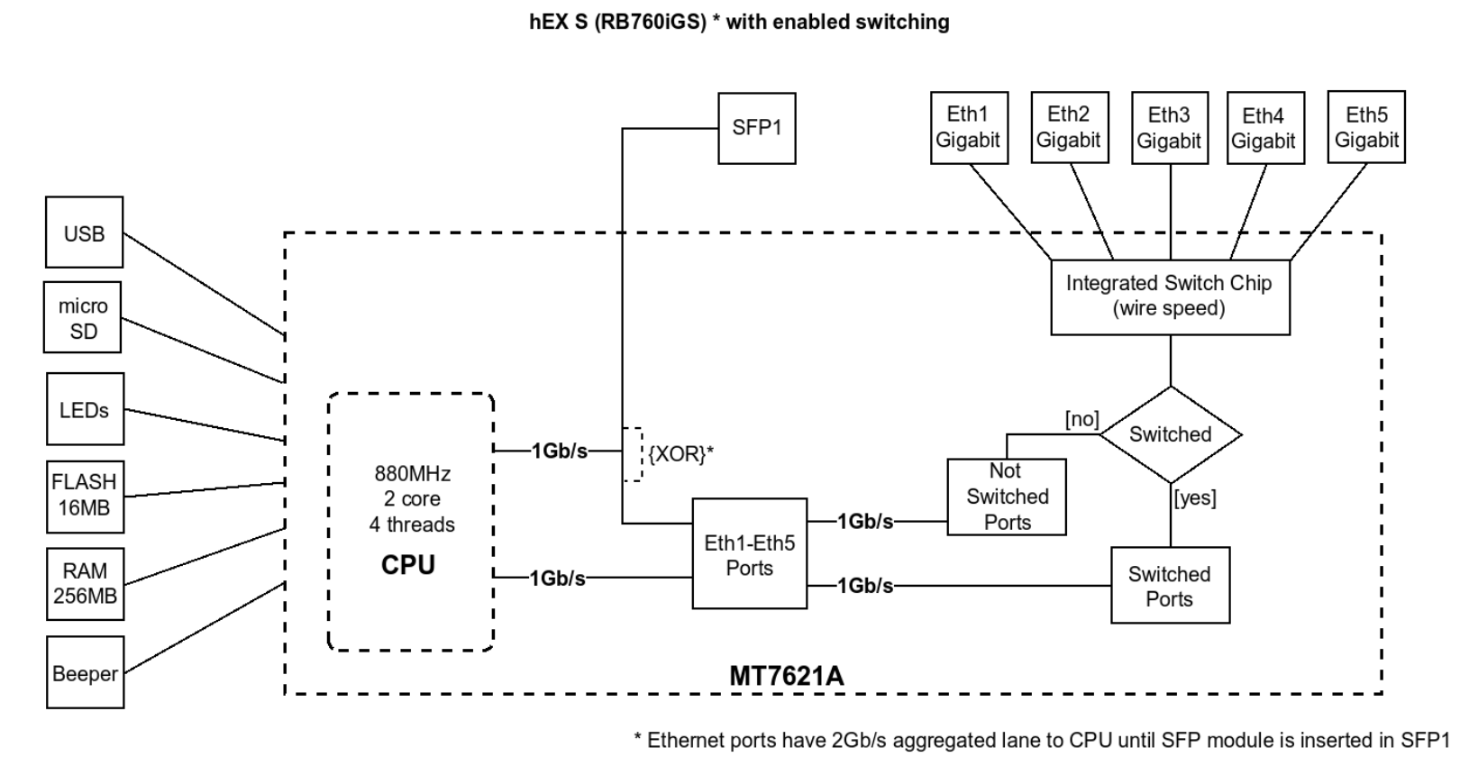 从RB760iGS的硬件设计图,可以看到SFP1端口不在交换机芯片,是独立的端口,所以无法支持硬件加速。