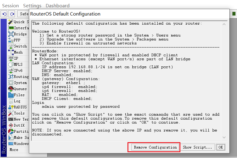 复位重启完成后,首次登录Winbox,会询问是否删除默认配置选项,选择Remove Configuration,不用之前的官方默认配置,这样将完全是一个空配置的设备: