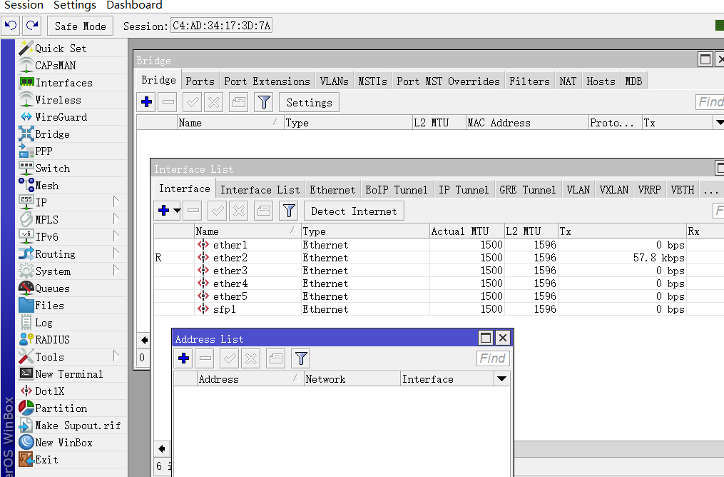 下面是所有官方配置被删除,可以看到bridge, interface,ip address都是空配置,截图是RB760iGS多了sfp1接口(下次复位官方配置也会重新载入,如果要彻底清除官方配置,可以使用netinstall重新刷机)