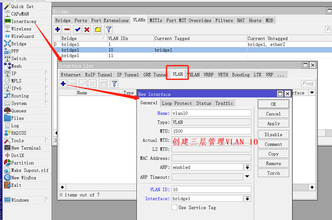 在Interface目录下,找到VLAN,并创建三层VLAN接口 vlan10,能让ether1接口下通过vlan10使用winbox管理