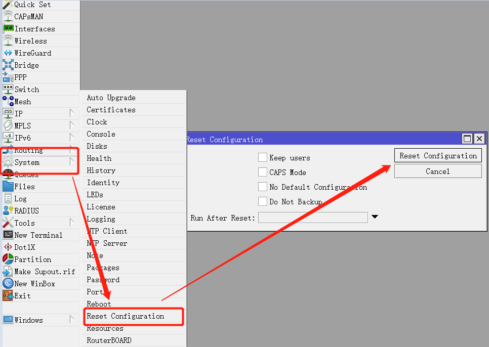 升级完成后,复位RB750Gr3的配置,从中如下,点击rest configuration后,会提示重启设备