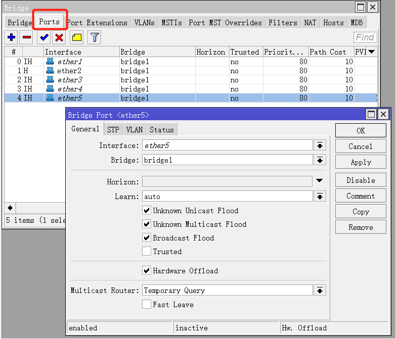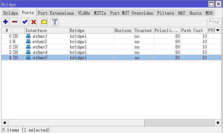 在bridge port目录下依次将ether1、ether2,ether3,ether4,ether5加入新键的Bridge1
