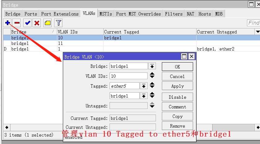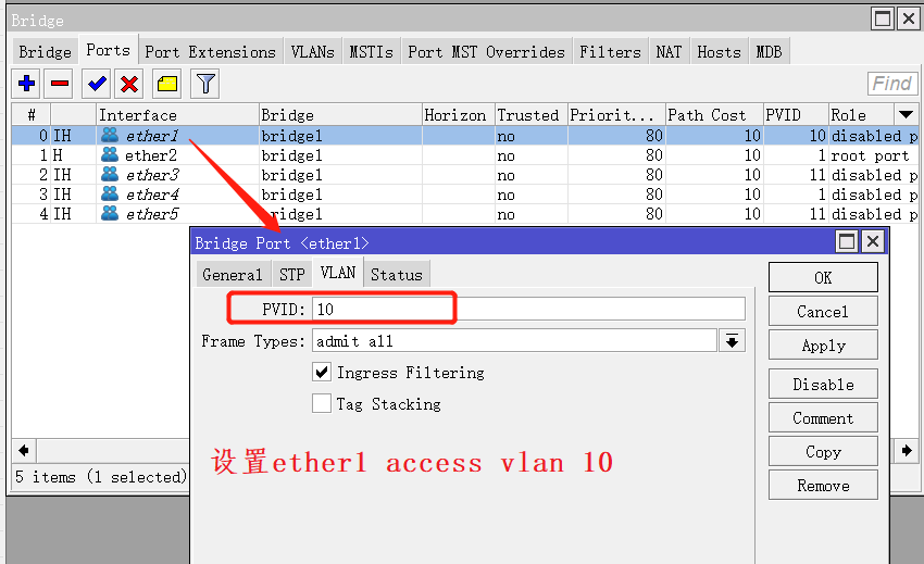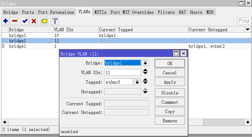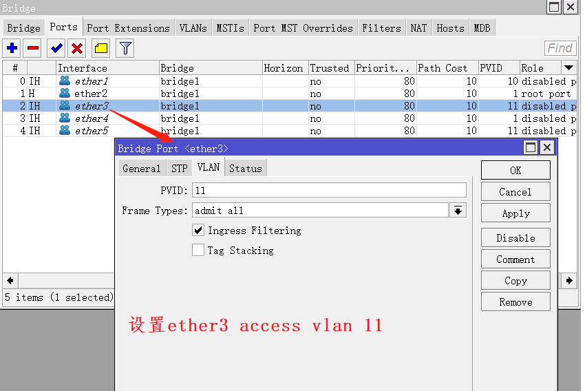 添加VLAN 11的tagged标记给ether5,VLAN11不作为管理VLAN,不用透传给Bridge
