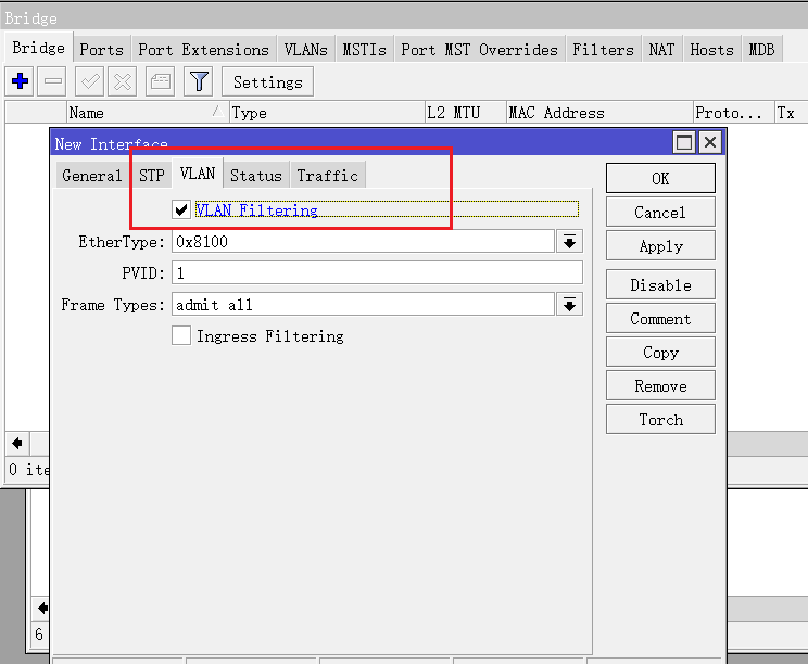 特别提示启用vlan-filtering后,当前所有端口都在vlan1,能通过vlan1使用winbox管理到RouterOS,如果修改管理端口的VLAN,需要确保该VLAN tagged到bridge