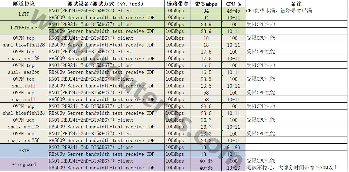RB5009性能远远高于KNOT(处理器QCA9531L 650MHz),KNOT作为低端设备,可以看到不同VPN协议和加密方式对CPU性能开销影响。