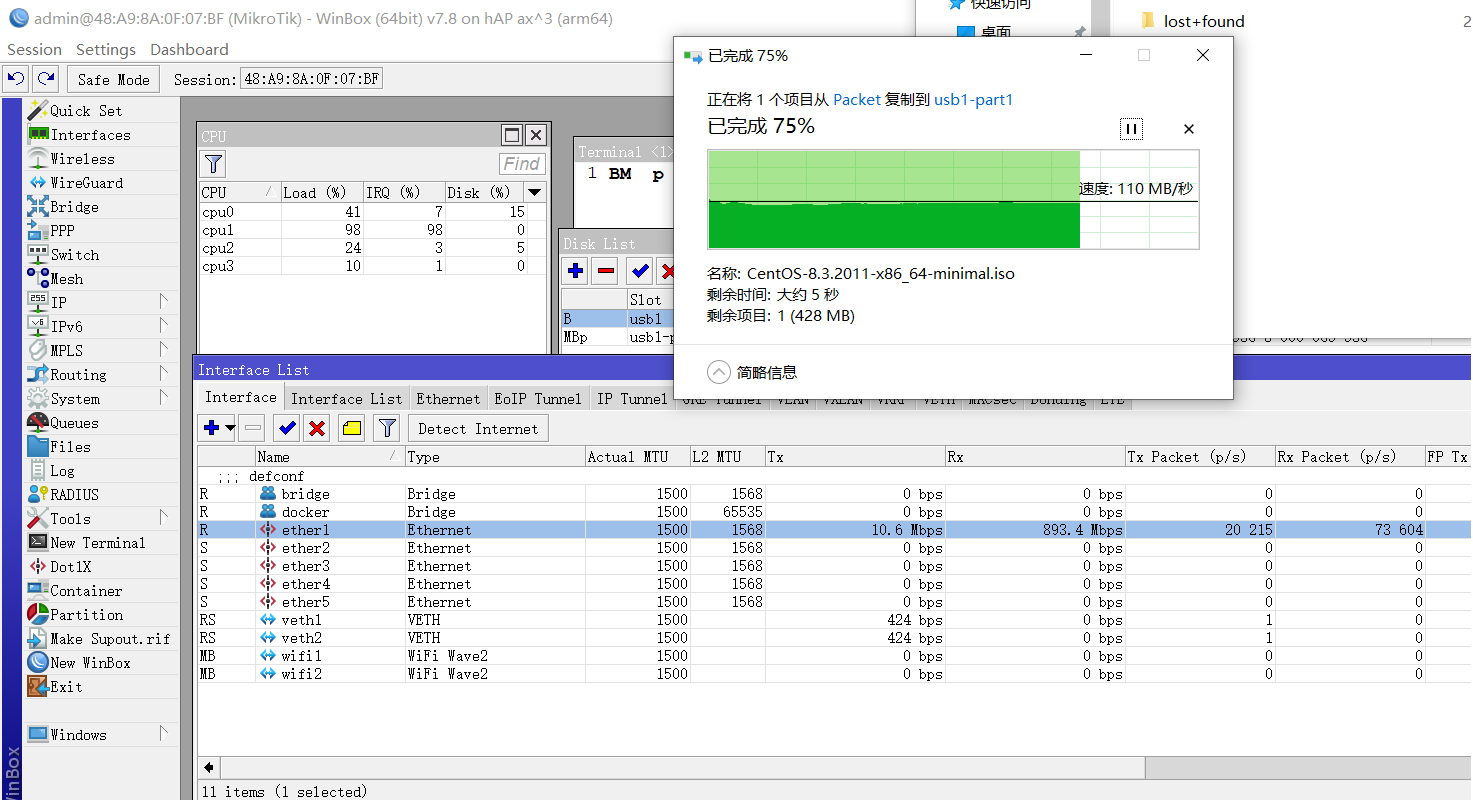 1Gb网络限制已经跑满,4个CPU负载也很高,CPU1已经98%,如果都是2.5Gb网卡传输,hAP ax3的CPU应该爆了!从测试看传输文件性能的确有很大改进,只能说明ROSE又增加了一个不务正业的功能!