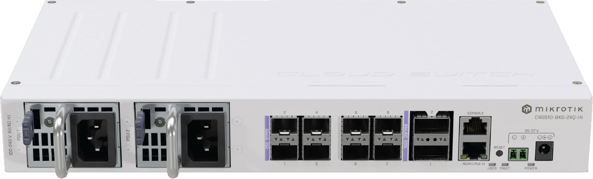 CRS510-8XS-2XQ-IN具有双热插拔电源,还有另外三种电源选项:PoE, DC插孔和一个2针直流端子供电