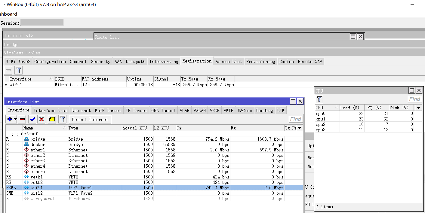 网络配置hAP ax3 (ether1口2.5G+WiFi,开启fasttrack,配置masquerade nat)->TPLink 2.5G交换机->2.5G的PVE服务器安装Ubunt20.04(Nginx+PHP+LiberSpeed),无线信号、速率和CPU情况如下:(测试仅供参考!)