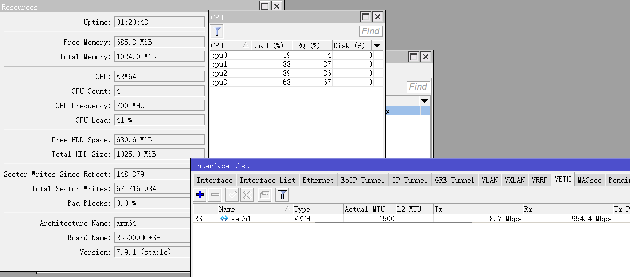 RB5009带宽测试的CPU情况(2.5Gbps):