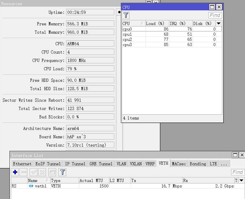 hAP ax3 带宽测试的CPU情况(2.5Gbps),在upload测试只有1.3Gbps: