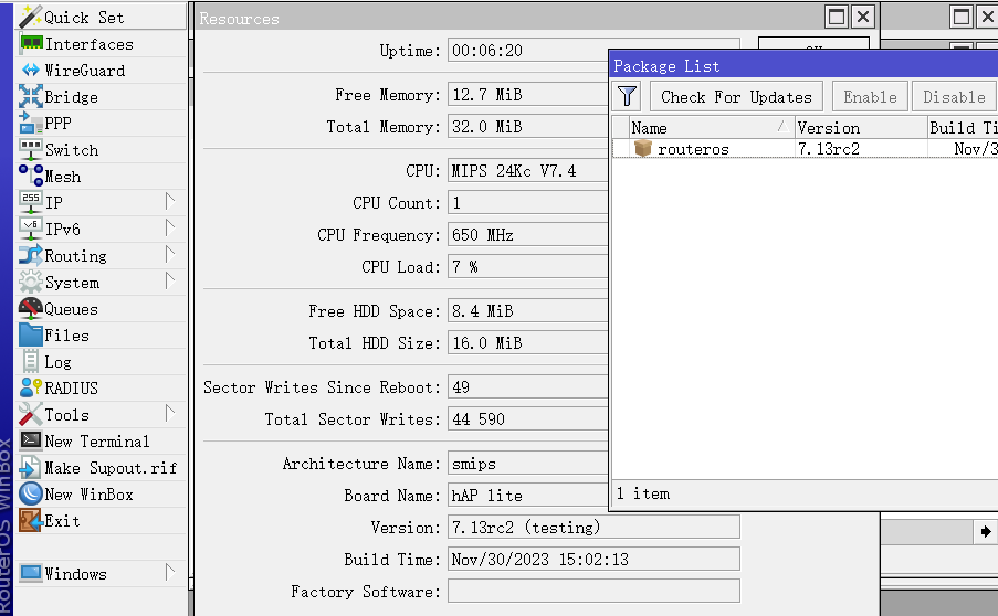 也就说必须将设备的版本升级或安装到7.12或7.12.1作为中间版本才能升级到7.13及以上。RouterOS和"wifi-qcom-ac"功能包共同占用16MB的闪存空间,如果是16MB的无线设备升级只能通过netinstall安装,无法在线升级!
