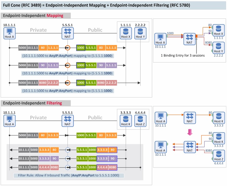 - full cone NAT(RFC 3489)= Endpoint-Independent Mapping (EIM) and Endpoint-Independent Filtering (EIF) RFC 5780.