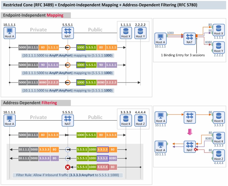 - restricted cone NAT(RFC 3489)= Endpoint-Independent Mapping (EIM) and Address-Dependent Filtering (ADF) in RFC 5780.