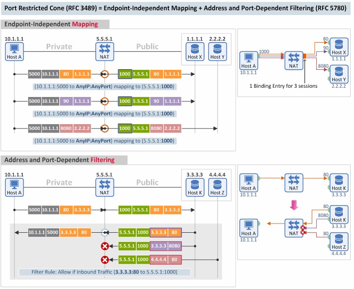 - port restricted cone NAT (RFC 3489)= Endpoint-Independent Mapping (EIM) and Address and Port-Dependent Filtering (APDF) in RFC 5780.