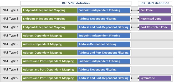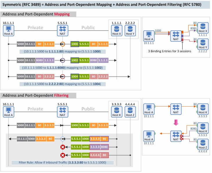 - symmetric NAT (RFC 3489)= Address and Port-Dependent Mapping (APDM) and Address and Port-Dependent Filtering (APDF) in RFC 5780.