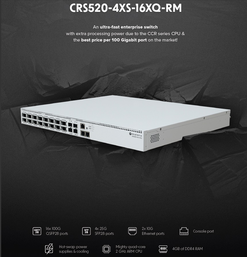 MikroTik 推出了CRS520-4XS-16XQ-RM 100G三层交换机,采用AL52400 2 GHz 4核心ARM处理器,4Gb DDR4内存,具有16 × 100千兆QSFP28端口,4 × 25千兆SFP28端口和一对10G以太网端口。CRS520-4XS-16XQ-RM可以给复杂的企业网络、数据中心、多媒体工作室和其他通常会使用多个设备的设置。现在一台CRS520-4XS-16XQ可以做到这一点!