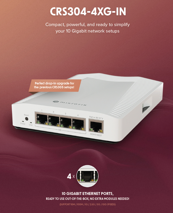 CRS304-4XG-IN 一种紧凑功能强大的万兆以太网交换机,新的CRS304配备了四个万兆以太网口。此外,还有一个额外的千兆以太网端口用于管理目的。